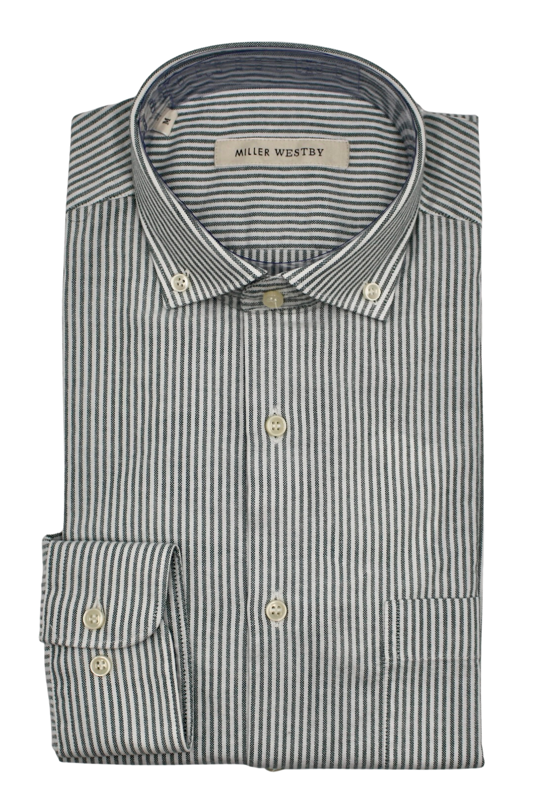 Timeless Oxford with a refined olive stripe pattern, delivering understated sophistication for the discerning dresser. This classic piece features the durability and breathability characteristic of quality Oxford cloth, while the subtle striping adds visual interest without compromising versatility. Perfect for layering or wearing solo, it transitions seamlessly from casual weekends to professional settings.