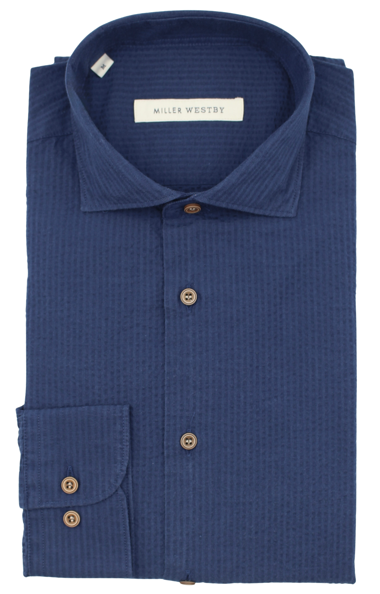 The PRESCOTT shirt features classic navy seersucker fabric, offering breathable comfort and subtle texture ideal for warm weather. Its wooden buttons add a refined, natural touch, while the cutaway collar provides a modern silhouette.
